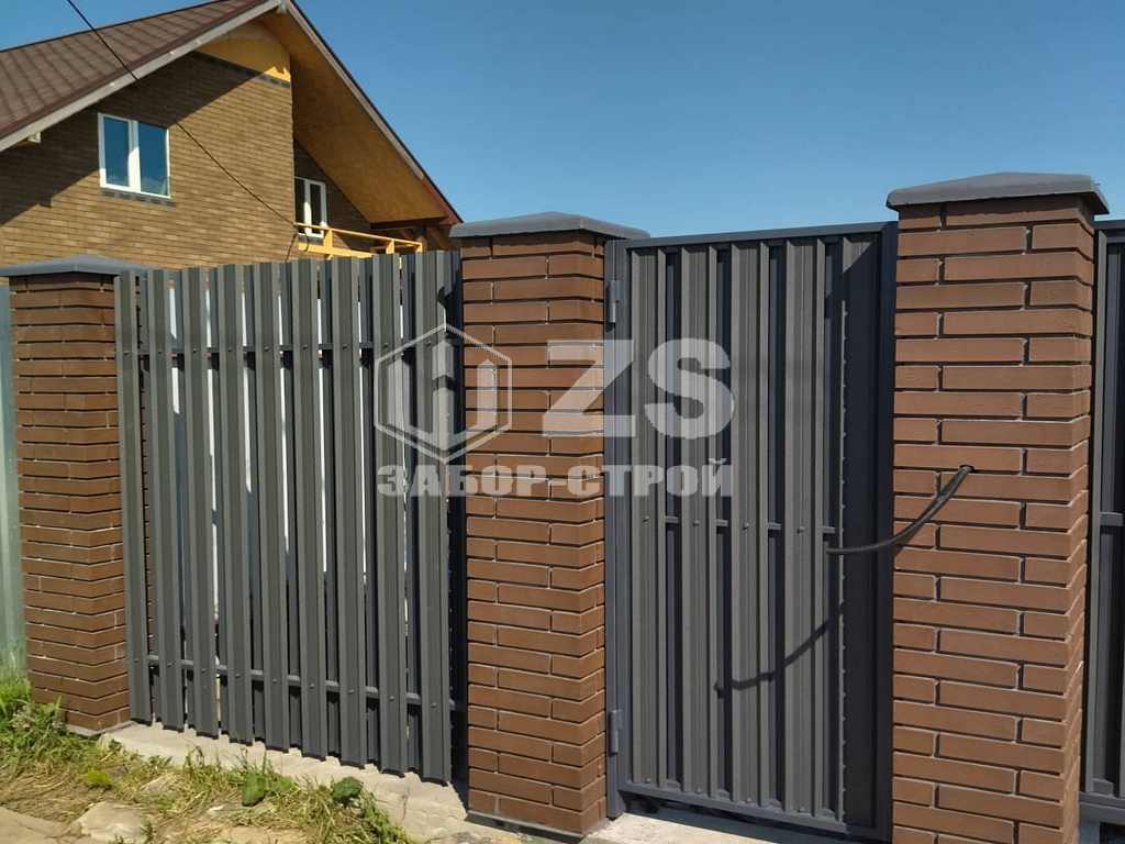 - Забор с кирпичными столбами из евроштакетника 45 метров