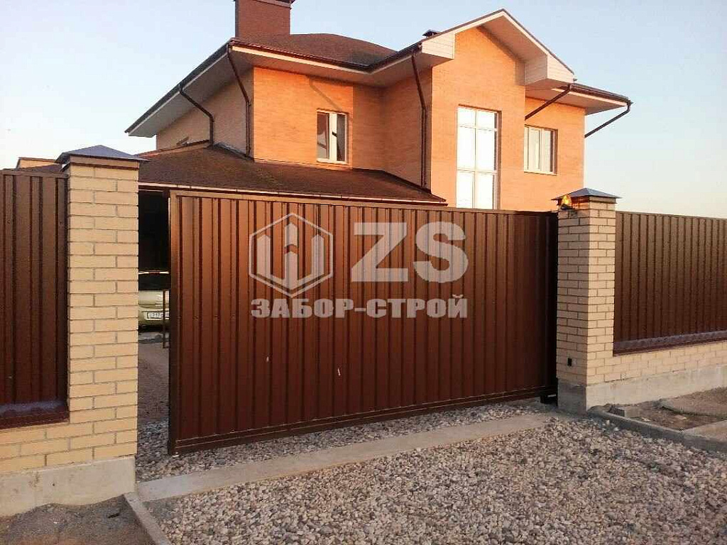 - Забор с кирпичными столбами из профнастила 10 соток