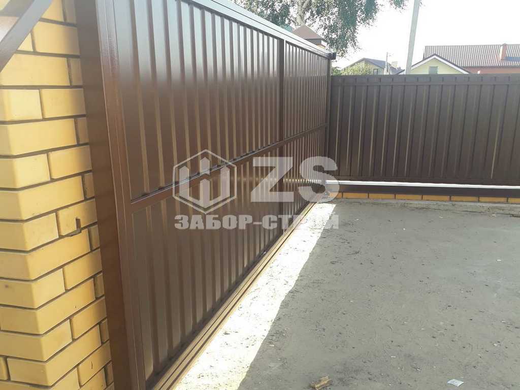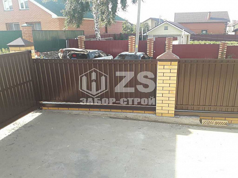- Забор с кирпичными столбами из профнастила 15 метров